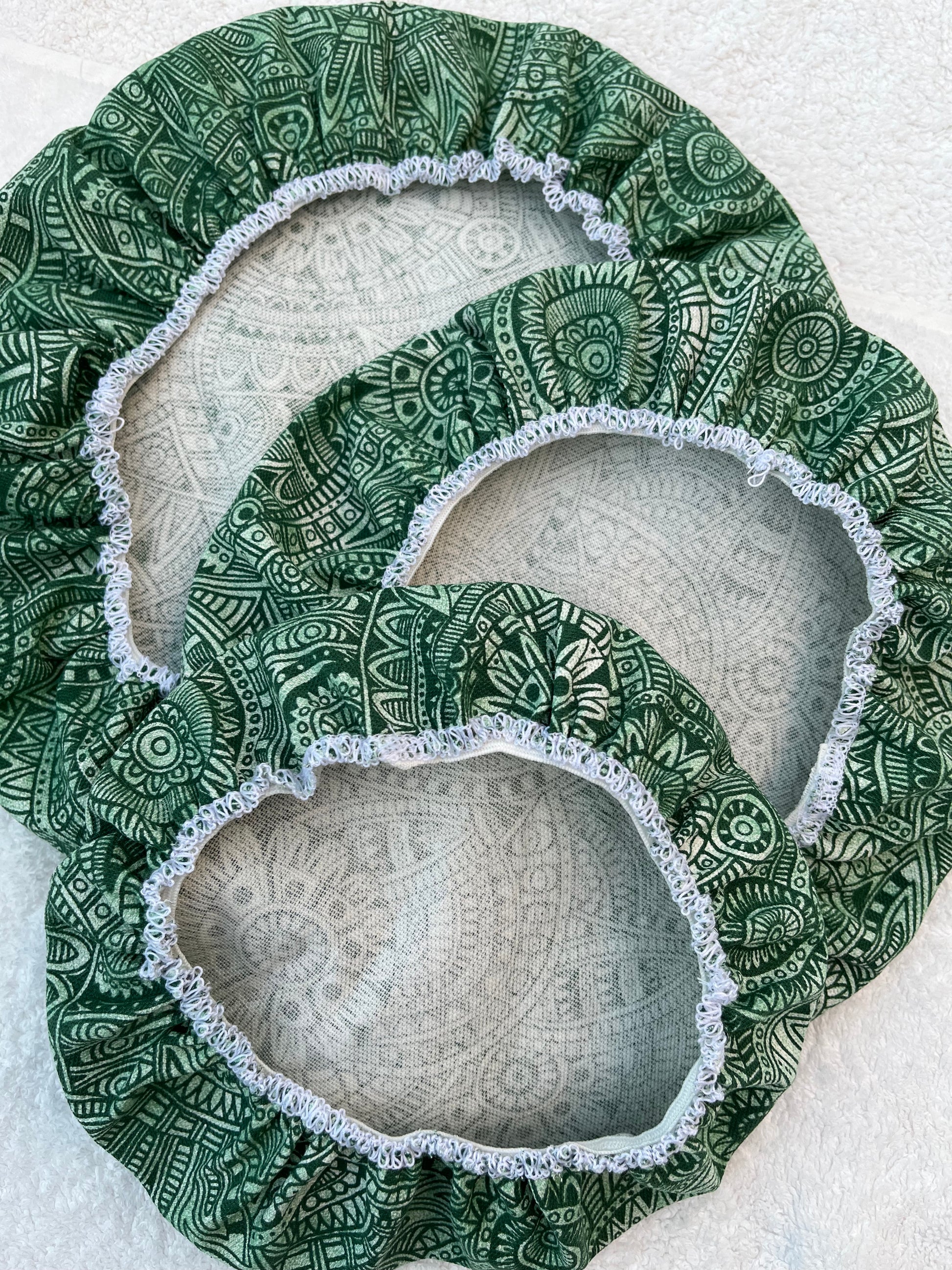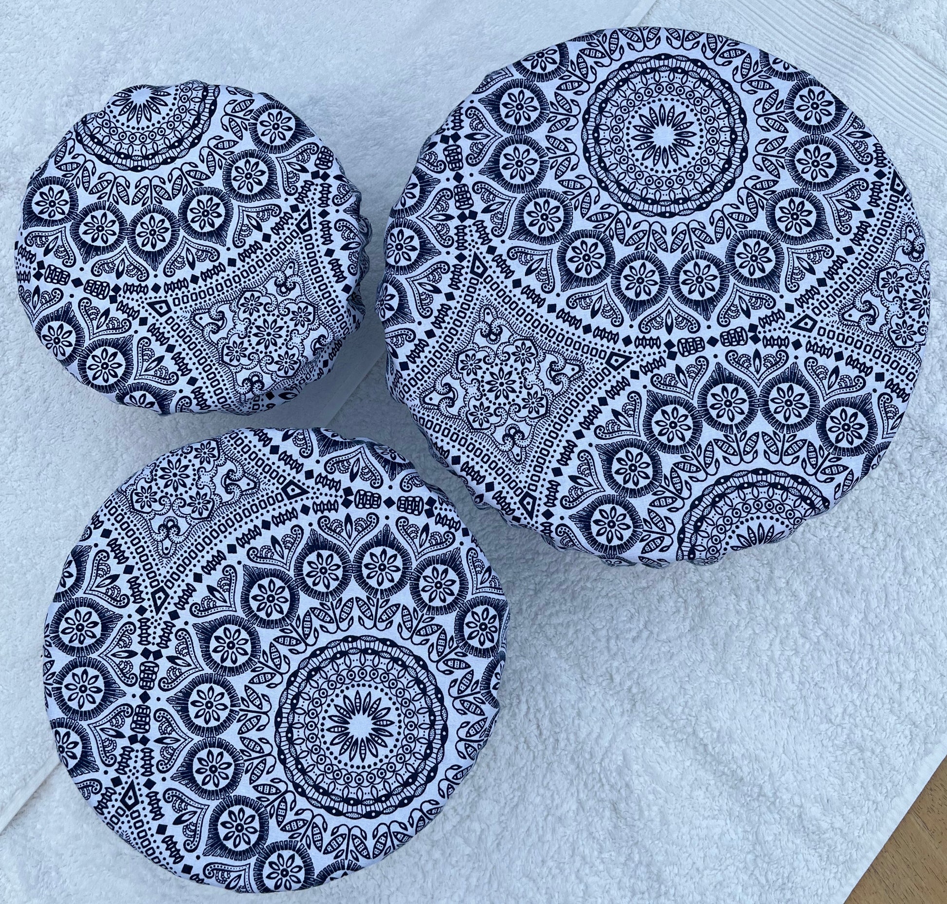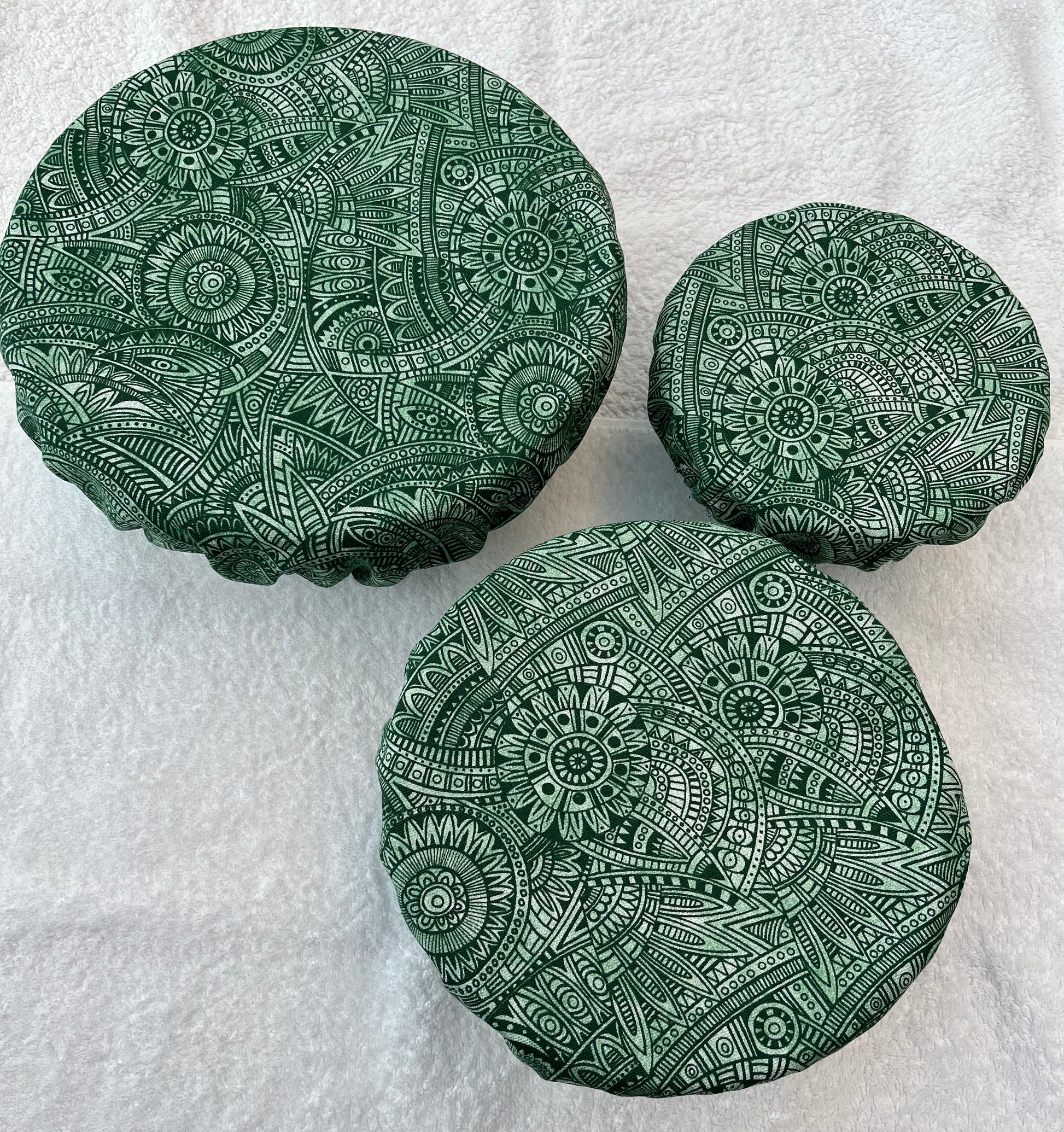 We have listed the sizes of our covered bowls, as shown on the photographs, below, but take note that, because of the elastic band and elasticity of the fabric, the covers are quite 'forgiving' and will fit a wide variety of bowls. You might want to try it on any shape of bowl, not just round, or use it to cover those left-over pancakes on a dinner plate!
