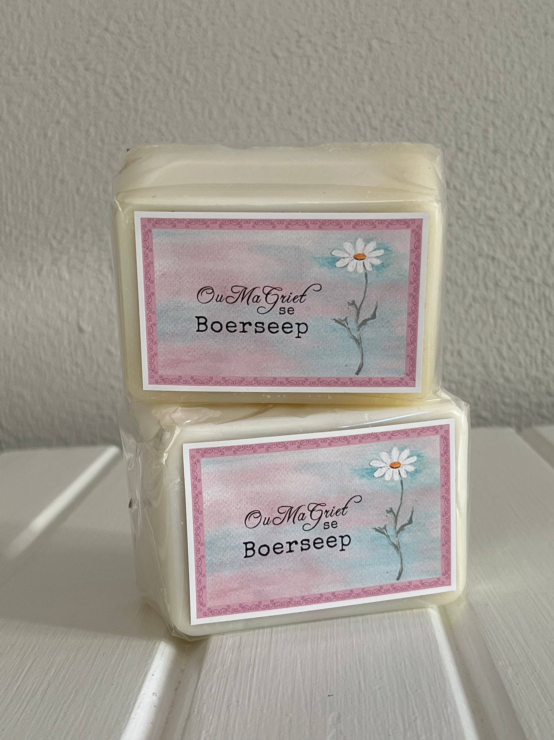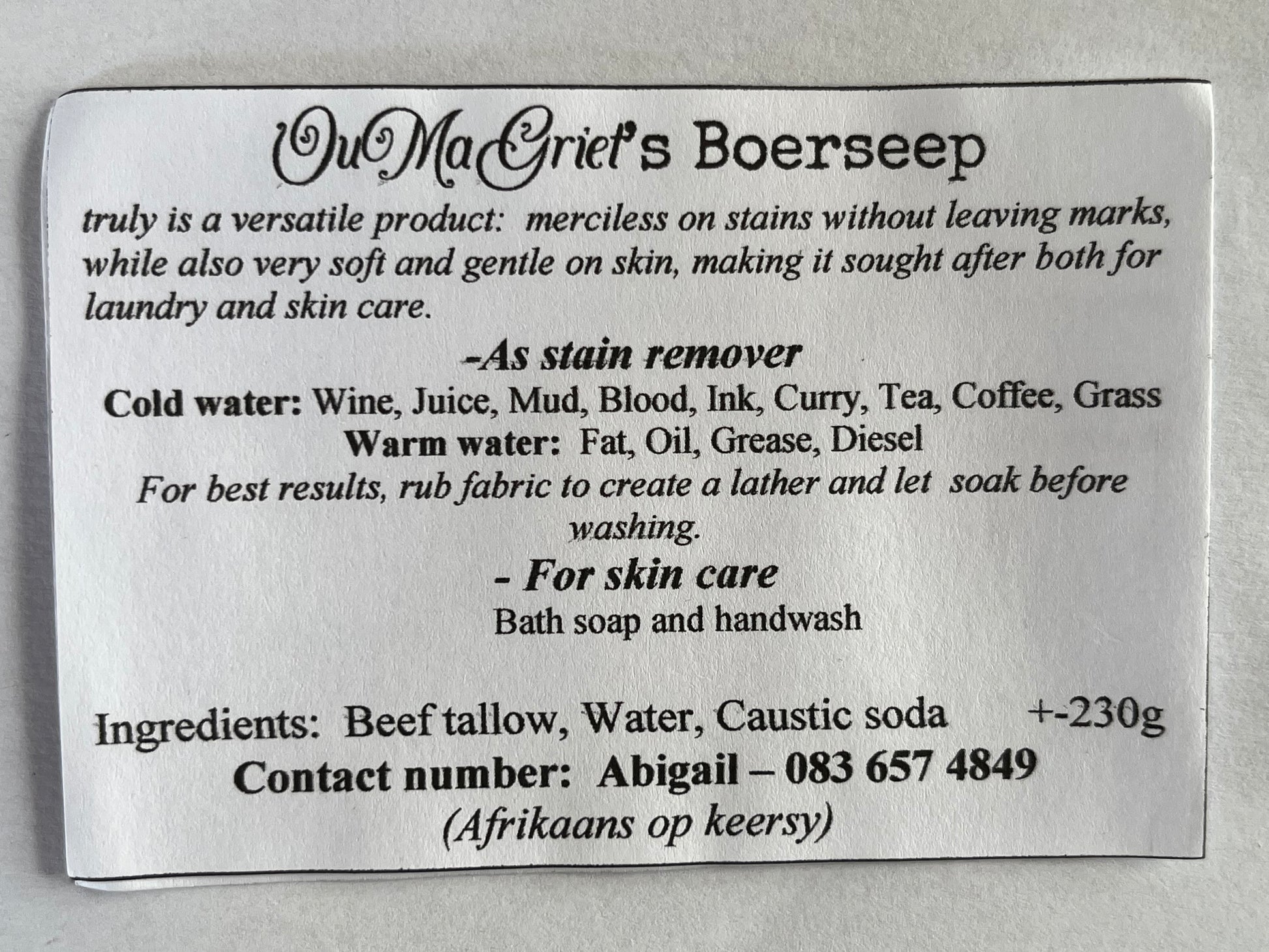 Boerseep is known for its effectiveness in removing stubborn stains including that of oil, grease, mud, grass, red wine, ink and blood. It is suitable for both laundry and general cleaning. Also used in skincare as bath soap and hand wash; it is very gentle on sensitive skin. Hand-made following a traditional South African recipe using natural ingredients.