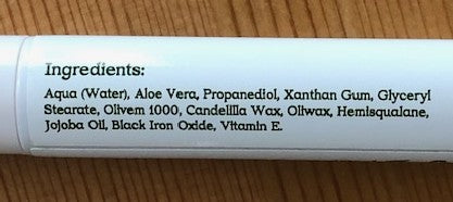 Ingredients: Water, Aloe vera, propanediol, xanthan gum, glyceryl stearate, olivem 1000, candelilla wax, oliwax, hemisqualane, jojoba oil, black iron oxide, vitamin E.