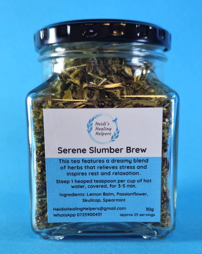 Serene Slumber Brew Tea in a glass jar (30g): Loose leave tea containing Lemon Balm, Passionflower, Skullcap and Spearmint. This is another unique blend that helps enable a good night's sleep. If taken as a bedtime tea, try to drink it more or less 2 hours before bedtime to get the most benefit. Shake the jar, then scoop out 1 rounded tsp (teaspoon) into a 250ml cup of hot, not boiling, water. Cover and steep for 3-5 min, stir, strain and enjoy. The addition of milk is not recommended, but feel free to add a sweetener of your choice if you want to.